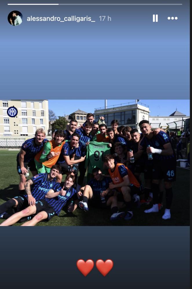 L'Inter Under 23 ha voluto dedicare la vittoria ottenuta sul campo della Pro Vercelli, che ha interrotto un periodo di digiuno di oltre due mesi, ad Alessandro Calligaris, costretto a prendersi una pausa forzata dopo l'intervento chirurgico al gomito del braccio sinistro a cui è stato sottoposto negli scorsi giorni. Il giovane portiere ha pubblicato su Instagram l'apprezzamento per il gesto dei compagni, che hanno posato per una foto davanti all'obiettivo facendo vedere in bella mostra la sua maglia.
