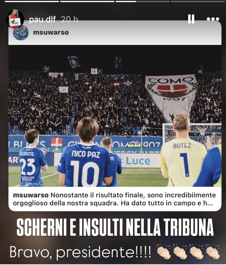 Paula de La Fuente, moglie di Javier Zanetti, applaude il messaggio di Mirwan Suwarso, presidente del Como, che ha condannato alcuni comportamenti che si sono verificati nella tribuna d'onore del Sinigaglia, durante la partita con l'Inter di domenica sera, dove i dirigenti della squadra ospite sono stati oggetto di insulti. "Bravo presidente", ha scritto su Instagram.