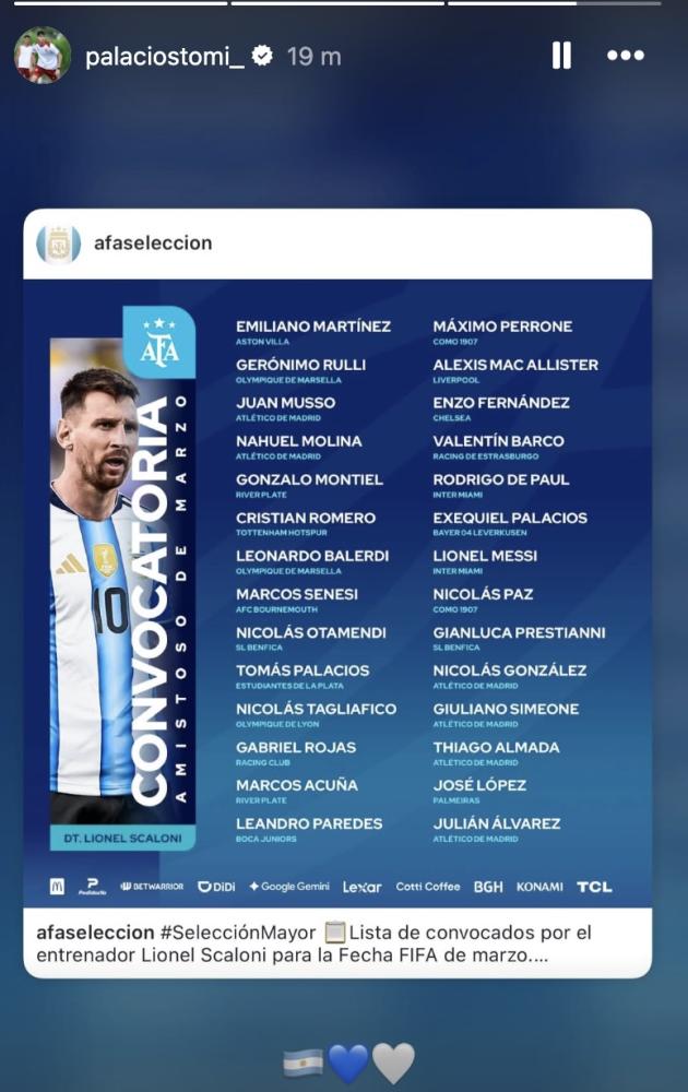 Una bandiera dell'Argentina e un cuore azzurro vicino a uno bianco. Tomas Palacios sceglie tre emoticon, su Instagram, per festeggiare la prima chiamata nell'Albiceleste, il 31 marzo impegnata in amichevole contro il Guatemala, sulla strada verso il Mondiale 2026. Una bella soddisfazione per il difensore di proprietà dell'Inter che ha saputo guadagnarsi la fiducia del selezionatore grazie alle prestazioni sfoderate negli ultimi tre mesi con l'Estudiantes, club nel quale è approdato a gennaio in prestito con diritto di riscatto.